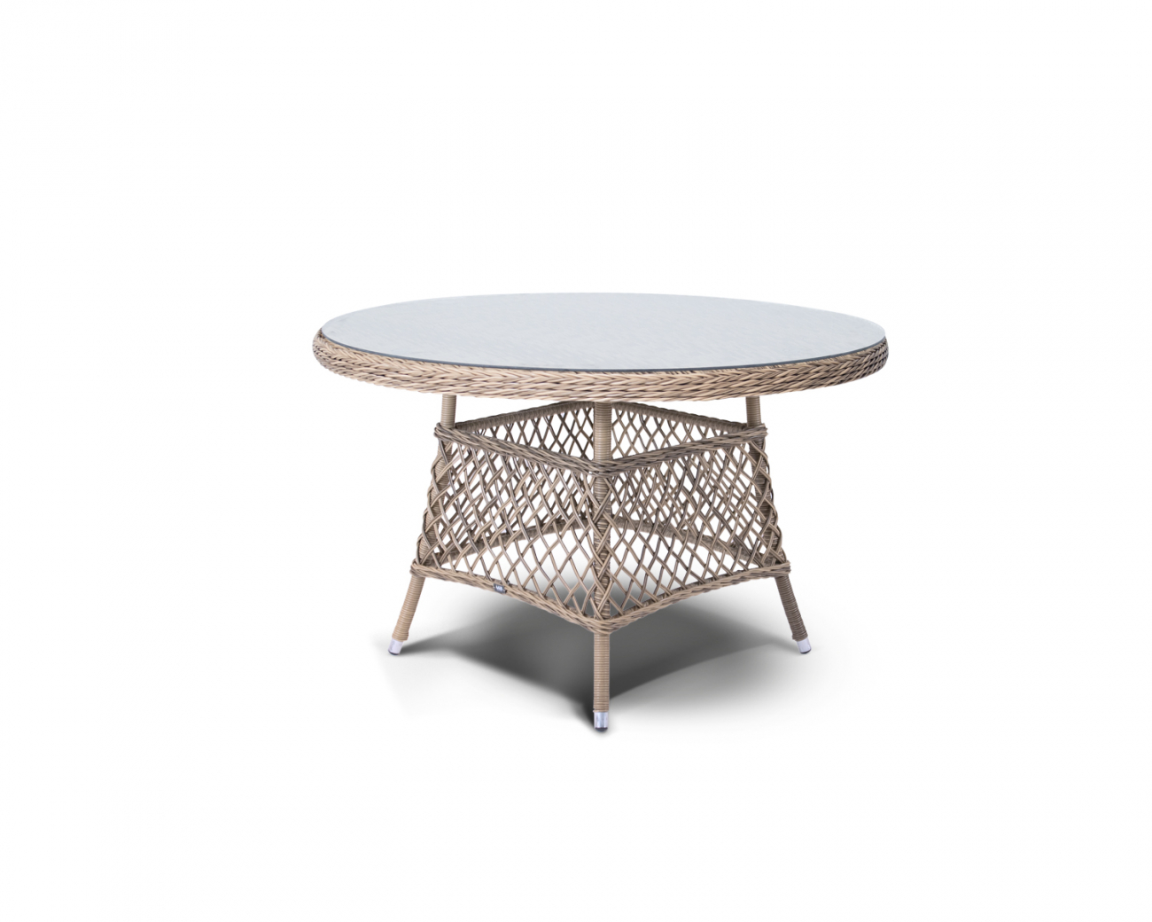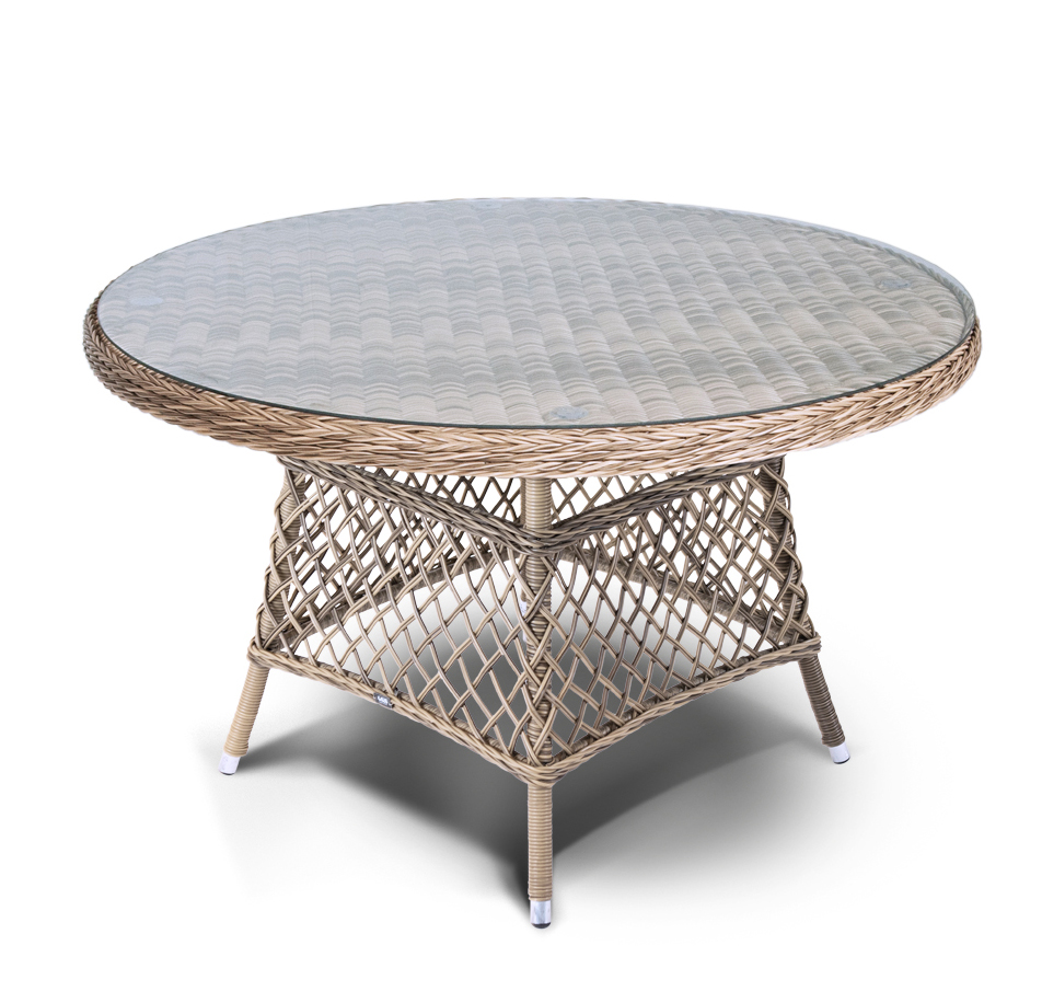 Эспрессо, стол со стеклянной столешницей толщиной 5мм, алюминиевый каркас, искусственный ротанг, ручное круглое плетение, диаметром 120 см, цвет соломенный